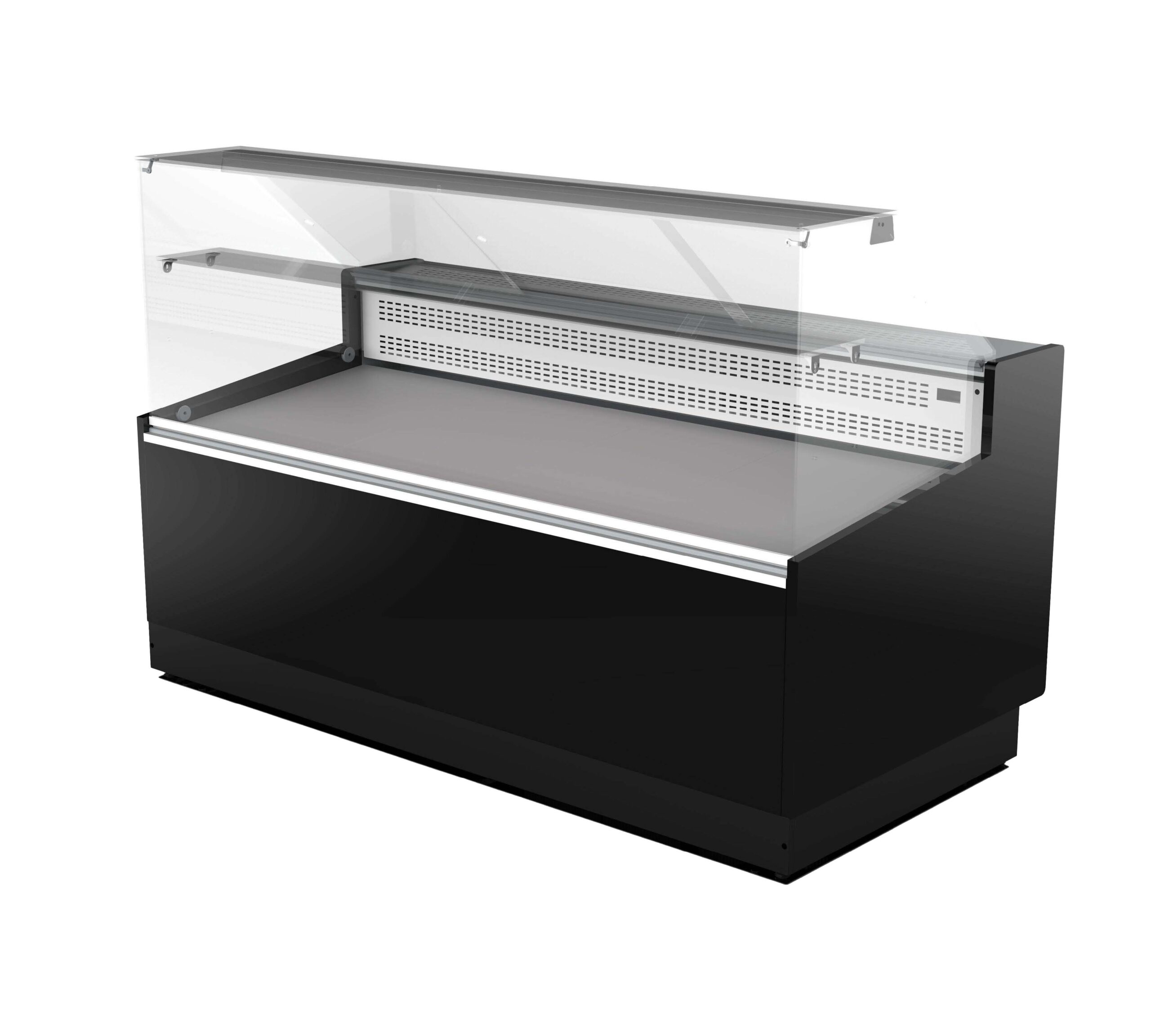 • Estructura superior en vidrio templado panorámico recto con frontal abatible y laterales preparados para la instalación de estante intermedio (opcional).